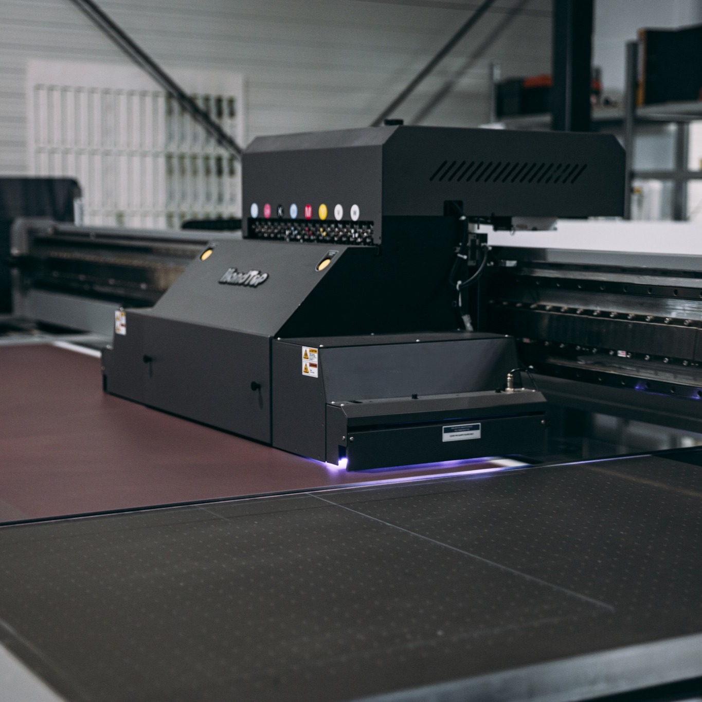 Mit unseren beiden Lösemitteldruckern können wir Breiten von bis zu 1,60 m bedienen, die UV – Direktdruckmaschine mit Sonderfarben weiß, mit der sich alle starren Medien bis zu 10 cm Höhe bedrucken lassen.